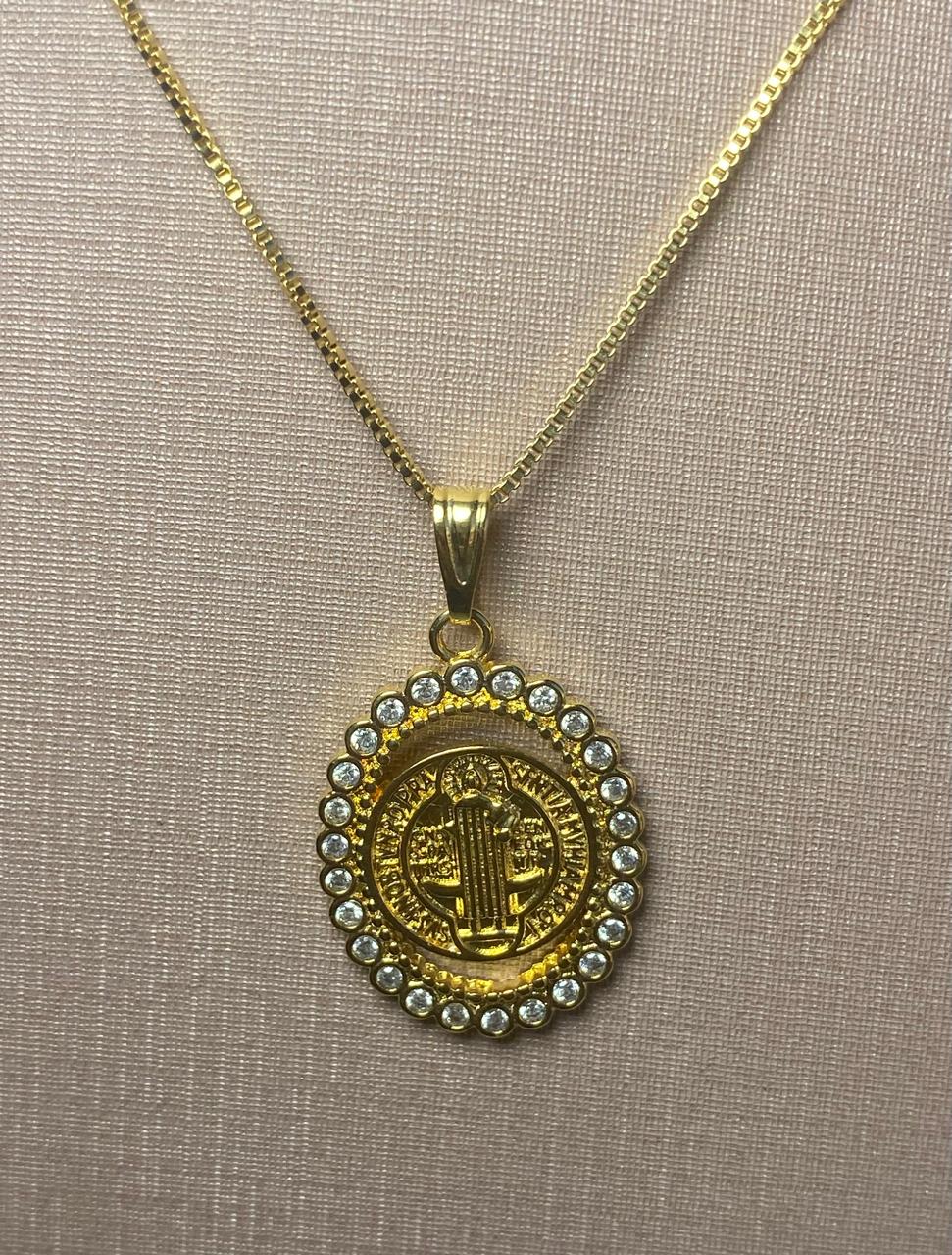 Início Banho de ouro Colares Colar Medalha de São Bento Cravejada